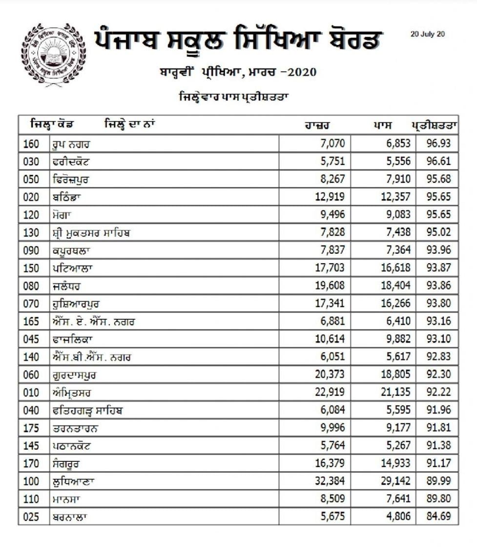 पंजाब स्कूल शिक्षा बोर्ड की ओर से मंगलवार को 12वीं क्लास का रिजल्ट जल्दबाजी में निकाल दिया गया। इस कारण इस बार पहले तीन स्थानों पर आने वाले स्टूडेंटस के नाम तक घोषित नहीं किए गए। इस बार बोर्ड का नतीजा 90.98 प्रतिशत रहा है। इसमें लड़कियां की पास प्रतिशतता 92 फीसदी और लड़कों की पास प्रतिशतता 89.56 रही है।