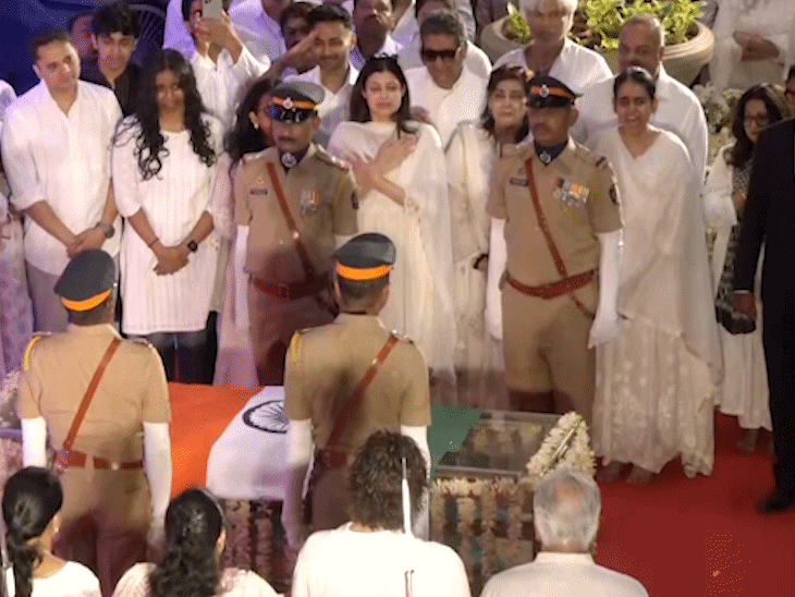 राजकीय सम्मान के लिए आशा भोसले का पार्थिव शरीर तिरंगे में लपेटा गया, जिसके बाद उन्हें सलामी दी गई है।