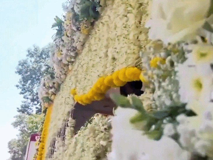 अंतिम यात्रा की तैयारी शुरू, सफेद फूलों से सजी गाड़ी