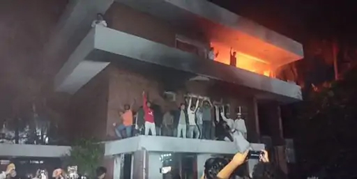 कुछ उपद्रवी आवास और संग्रहालय में भी घुस गए। बालकनी पर चढ़ गए और तोड़फोड़ की। बताया जा रहा है कि आवास में आगजनी भी की गई है। इसके कई वीडियो और तस्वीरें सोशल मीडिया पर वायरल हो रहे हैं।