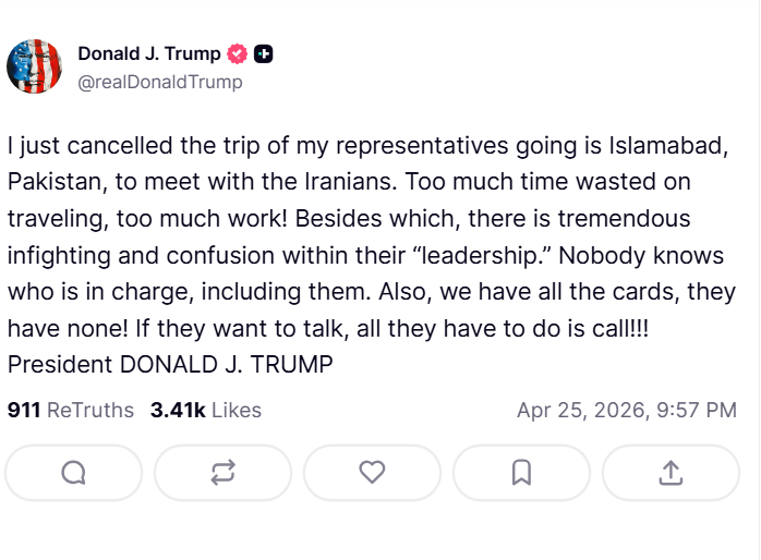 ट्रुथ सोशल पर पोस्ट कर उन्होंने कहा कि इतनी लंबी यात्रा की जरूरत नहीं थी और उनके पास करने के लिए ज्यादा काम है। ट्रम्प ने यह भी कहा कि ईरान के नेतृत्व में भ्रम और अंदरूनी खींचतान है।