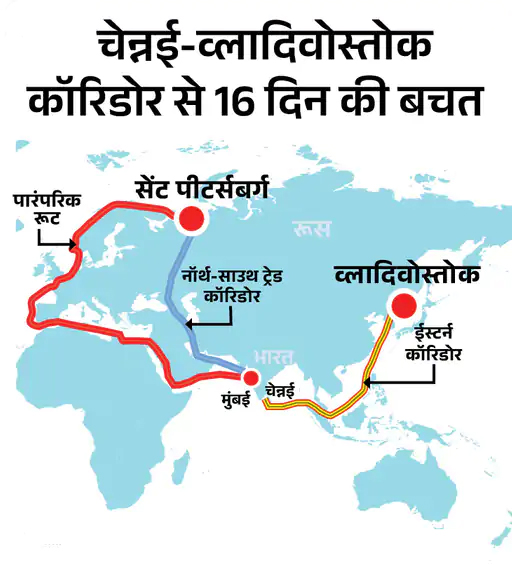 रूस के राष्ट्रपति व्लादिमीर पुतिन की भारत यात्रा के दौरान दोनों देशों के बीच चेन्नई-व्लादिवोस्तोक ईस्टर्न कॉरिडोर को लेकर चर्चा हुई। यह कॉरिडोर सिर्फ 10,370 किमी लंबा होगा, जिससे भारतीय जहाज औसतन 24 दिन में रूस पहुंच सकेंगे।