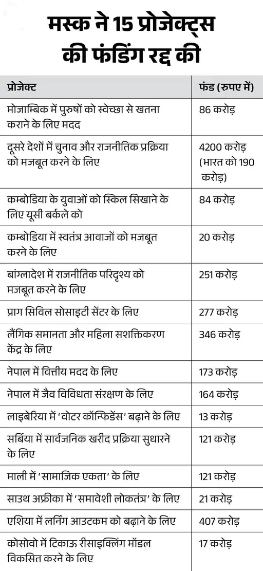 DOGE ने एक लिस्ट जारी की है। इसमें डिपार्टमेंट की तरफ से 15 तरह के प्रोग्राम्स की फंडिंग रद्द की गई है। इसमें एक प्रोग्राम दुनियाभर में चुनाव प्रक्रिया को मजबूत बनाने के लिए भी है, जिसका फंड 4200 करोड़ रुपए है। इस फंड में भारत की हिस्सेदारी 182 करोड़ रुपए की है।