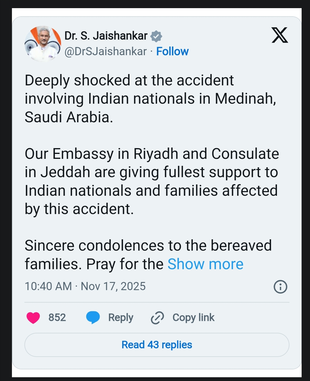 विदेश मंत्री एस जयशंकर ने सऊदी अरब में हुए हादसे पर दुख जताया। जयशंकर ने कहा- ‘मदीना में भारतीय नागरिकों के साथ हुई दुर्घटना से गहरा सदमा पहुंचा है। रियाद स्थित हमारा दूतावास दुर्घटना से प्रभावित भारतीय नागरिकों और उनके परिवारों को पूरी सहायता प्रदान कर रहे हैं।’