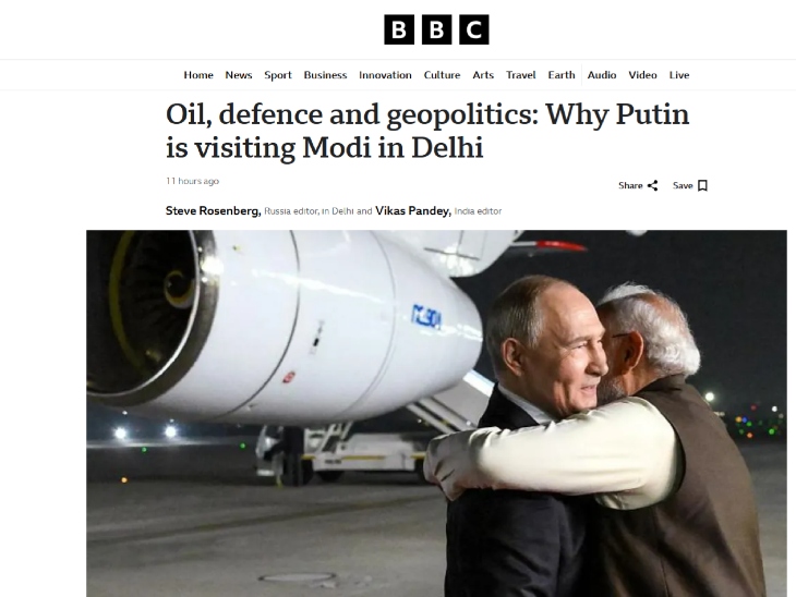 पुतिन के भारत दौरे पर वर्ल्ड मीडिया:BBC ने कहा- अमेरिकी दबाव के बीच पुतिन भारत पहुंचे, यूक्रेनी मीडिया ने लिखा- भारतीय डिप्लोमेसी की परीक्षा