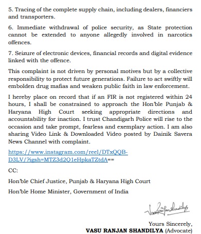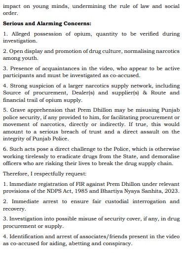 युवाओं के दिमाग पर डालता है प्रभाव उक्त वीडियो की तत्काल जांच और कार्रवाई की आवश्यकता है क्योंकि यह प्रथम दृष्टया एनडीपीएस एक्ट, 1985 के तहत गंभीर संज्ञेय अपराधों का खुलासा करता है। भारत पहले से ही नशीले पदार्थों की समस्या के कारण एक महत्वपूर्ण चरण से गुजर रहा है, और प्रभावशाली सार्वजनिक हस्तियों द्वारा नशीले पदार्थों का कोई भी महिमामंडन या कब्जा युवा दिमाग पर खतरनाक और अपरिवर्तनीय प्रभाव डालता है, जो कानून के शासन और सामाजिक व्यवस्था को कमजोर करता है।