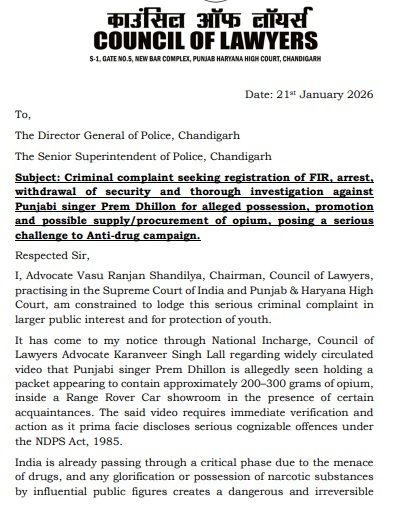 काउंसिल ऑफ लॉयर्स के चेयरमैन वासु रंजन शांडिल्य ने बताया कि उन्होंने एक वीडियो देखा, जिसमें पंजाब के सिंगर प्रेम ढिल्लों कार के शोरूम में अफीम के पैकेट के साथ दिखाई दे रहे हैं। यह वीडियो सिंगर ने अपने फेसबुक अकाउंट पर डाला था।