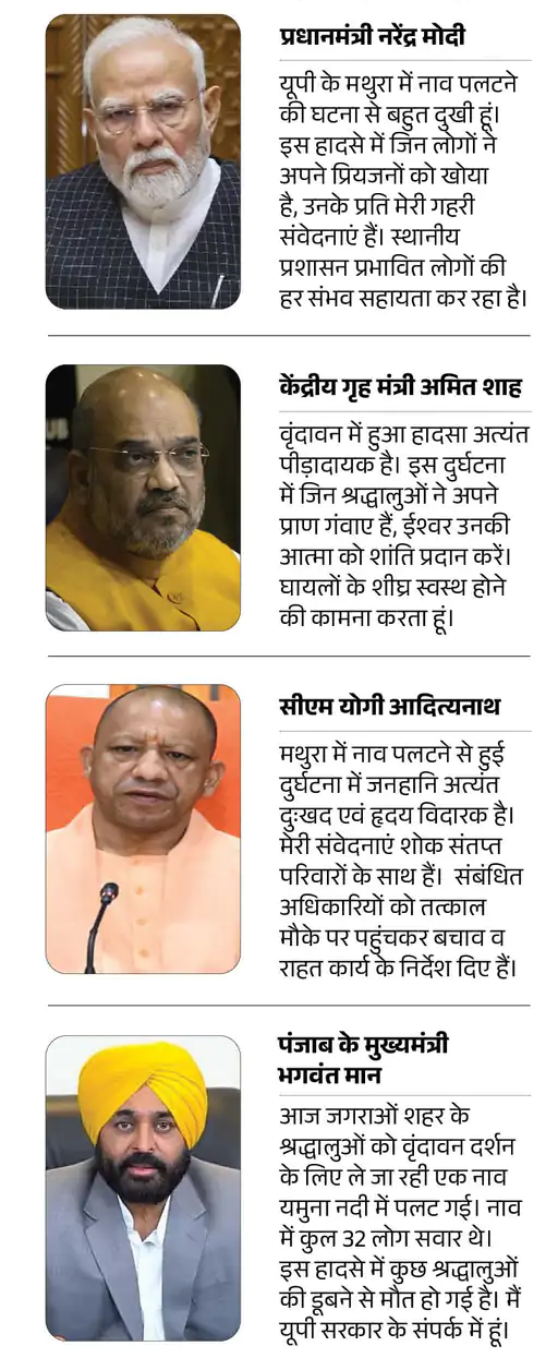 डीएम चंद्र प्रकाश सिंह ने बताया, हादसा दोपहर करीब 3 बजे केसी घाट पर हुआ, जो श्रीबांके बिहारी मंदिर से करीब 2 किमी की दूरी पर है। रात 10 बजे तक आर्मी और NDRF रेस्क्यू में जुटी हैं। नाव को बाहर निकाल लिया गया है। लापता की तलाश चल रही है।