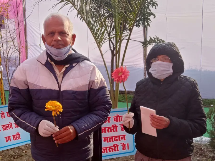 106 साल की कांता देवी के मतदान केंद्र पहुंचने पर मतदान कर्मियों ने उन्हें फूलों का बुके देकर स्वागत किया।
