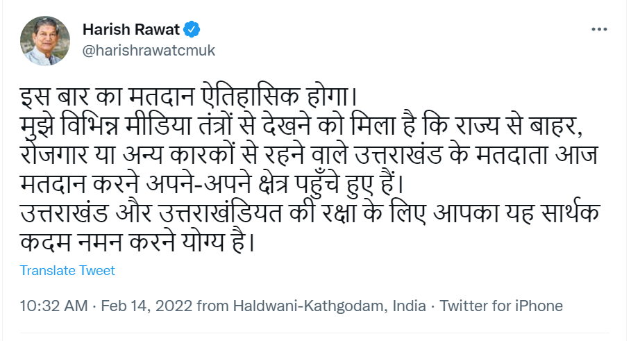 • पूर्व सीएम हरीश रावत ने ट्वीट कर राज्य में इस बार के मतदान के ऐतिहासिक बताया है। उन्होंने वोट डालने के लिए दूसरे राज्यों से वापस घर लौटे उत्तराखंडियों के प्रयास को नमन करने योग्य बताया है।