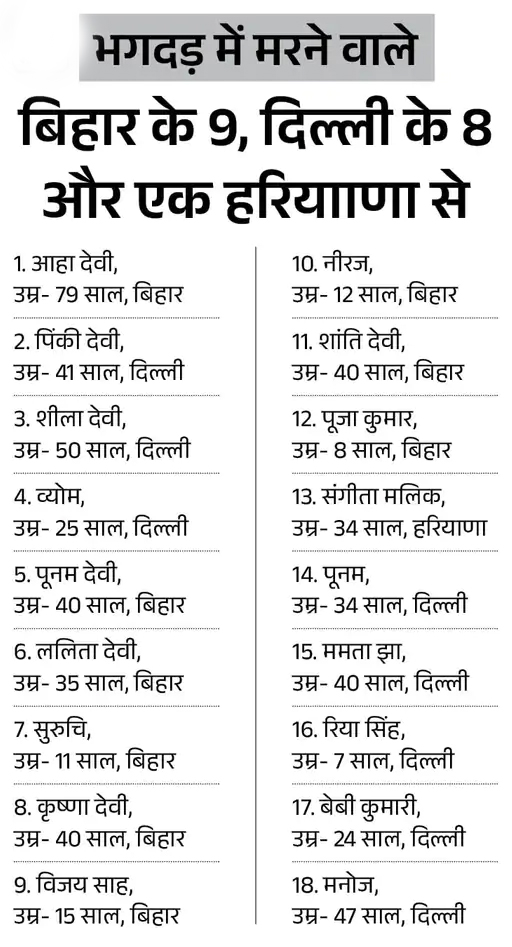 नई दिल्ली रेलवे स्टेशन पर शनिवार रात करीब 9:26 बजे भगदड़ से 18 लोगों की मौत हो गई। मरने वालों में 14 महिलाएं और 4 पुरुष शामिल हैं। इनमें 4 बच्चे हैं। 25 से ज्यादा लोग घायल हैं। हालांकि प्रशासन ने 15 घायलों की सूची जारी की है।
