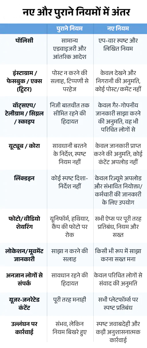 समय के साथ इंफॉर्मेशन की दुनिया बदल रही सेना से जुड़ एक सूत्र ने बताया कि गाइडलाइंस में यह बदलाव कुछ दिन पहले किया गया था। जानकारी अब सामने आई है और यह भारतीय सेना के सभी रैंकों पर लागू होता है।