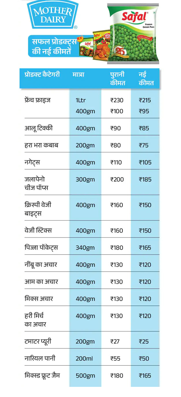 इसमें टेट्रा पैक दूध, पनीर, चीज, घी, मक्खन, आइसक्रीम और सफल ब्रांड के प्रोसेस्ड फूड शामिल है। 1 लीटर UHT टोंड मिल्क (टेट्रा पैक) अब 77 रुपए के बजाय 75 रुपए में मिलेगा। वहीं, 450ml UHT डबल टोंड मिल्क की कीमत 33 रुपए से घटकर 32 रुपए हो गई है।