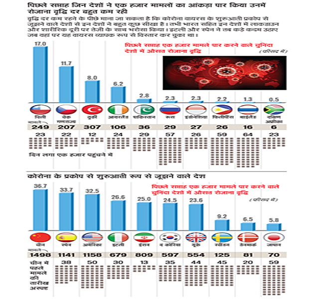 पिछले सप्ताह जिन देशों ने एक हजार मामलों का आंकड़ा पार किया उनमें रोजाना वृद्धि दर बहुत कम रही : वृद्धि दर कम रहने के पीछे माना जा सकता है कि कोरोना वायरस के शुरुआती प्रकोप से जूझने वाले देशों से इन देशों ने बहुत कुछ सीखा है। तभी भारत सहित इन देशों में लाकडाउन और शारीरिक दूरी पर तेजी के साथ भरोसा किया। इटली और स्पेन ने तब कड़े कदम उठाए जब वहां पर यह वायरस व्यापक रूप से विस्तार कर चुका था।