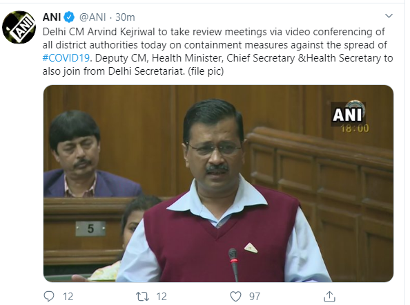 समाचार एजेंसी एएनआइ के अनुसार दिल्ली के सीएम अरविंद केजरीवाल COVID19 के प्रसार के खिलाफ रोकथाम के उपायों पर आज सभी जिला अधिकारियों के साथ वीडियो कॉन्फ्रेंसिंग के जरिए समीक्षा बैठक करेंगे। दिल्ली सचिवालय से डिप्टी सीएम, स्वास्थ्य मंत्री, मुख्य सचिव और स्वास्थ्य सचिव भी शामिल होंगे।