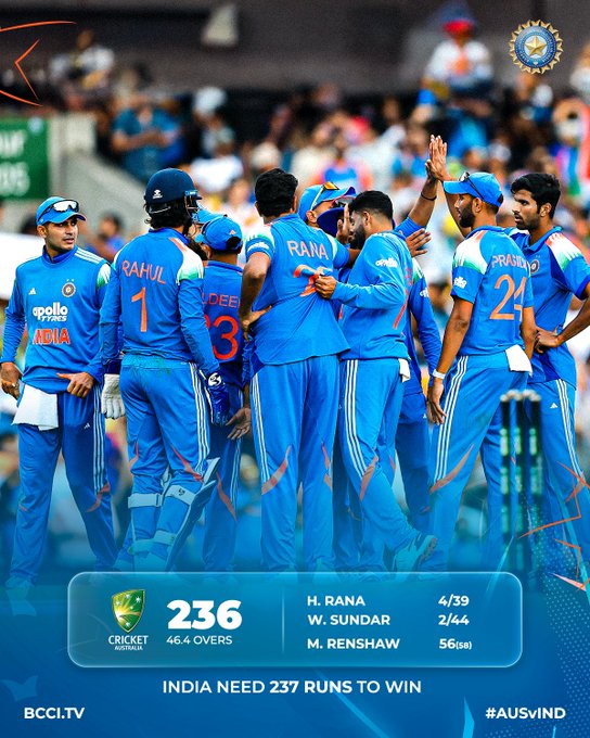 मिचेल मार्श ने लगातार तीसरी बार टॉस जीता और पहले बैटिंग करने का फैसला किया। ऑस्ट्रेलियाई टीम 46.4 ओवर में 236 रन बनाकर ऑलआउट हो गई। हर्षित राणा ने 4 विकेट लिए।