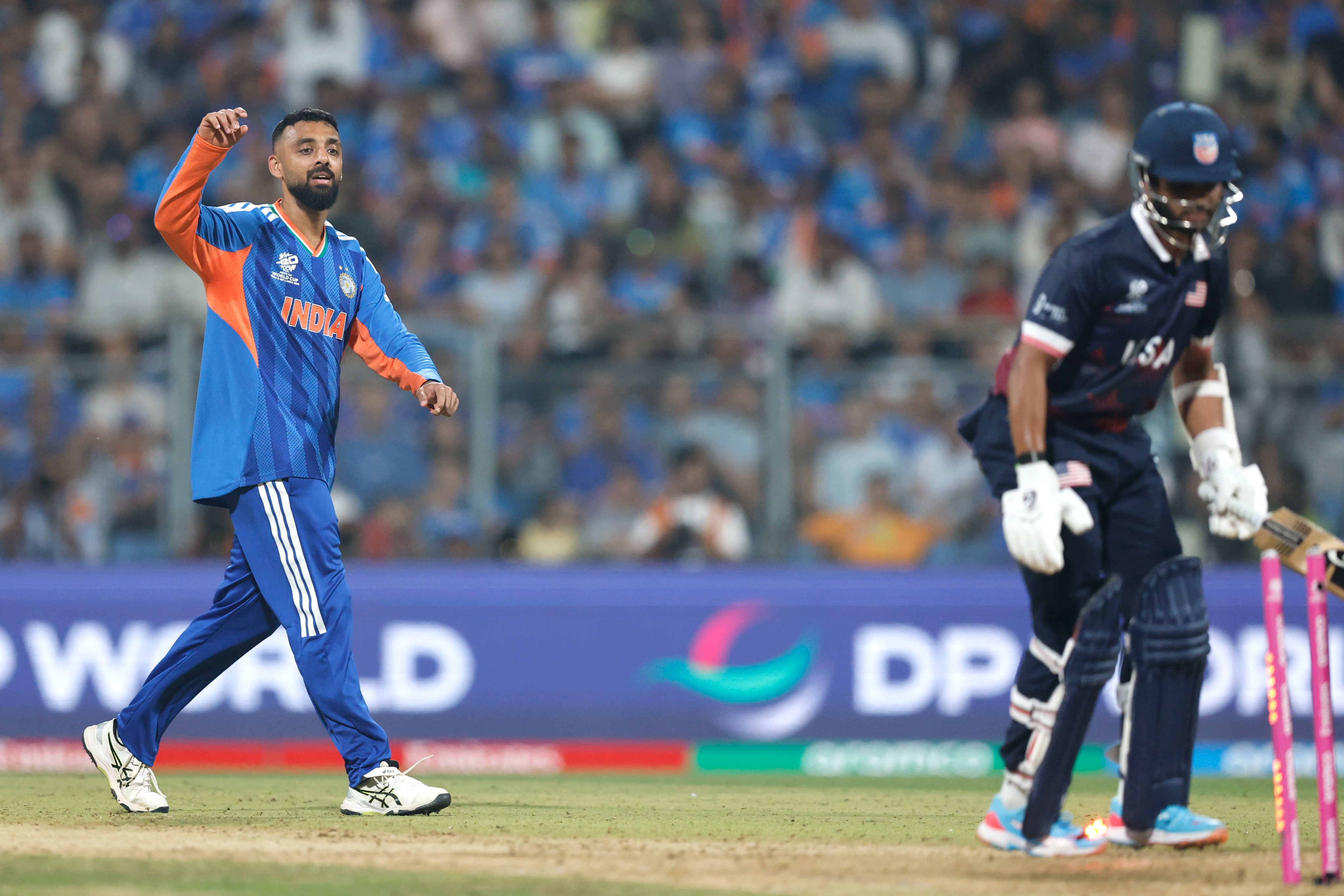 अमेरिकी टीम के 3 विकेट 13 रन पर ही गिर गए थे। मोहम्मद सिराज ने एंड्रीज गौस और साईतेजा मुक्कामाला को कैच कराया। अर्शदीप सिंह ने मोनांक पटेल को पवेलियन भेजा।