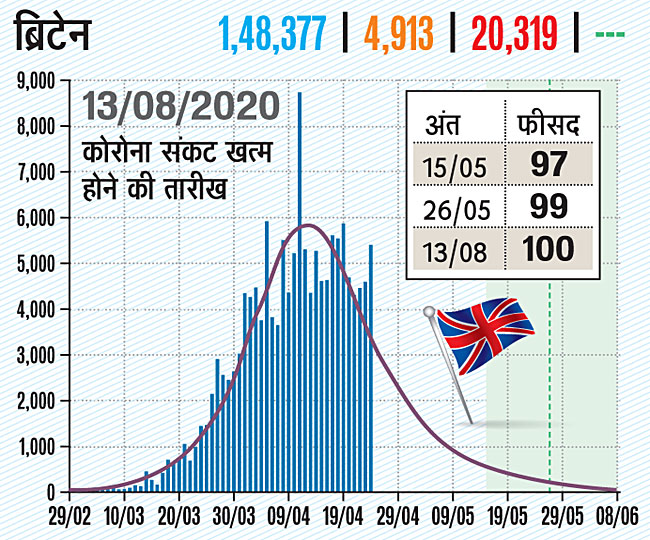 ब्रिटेन में भी 29 फरवरी से इसका संक्रमण देखने को मिला। यहां एक लाख 48 हजार 377 लोग इससे संक्रमित हुए, इनमें से 20 हजार 319 लोगों की मौत हो गई और अभी तक 4 हजार 913 नए मामले भी सामने आ चुके हैं। यहां 15 मई तक 97 फीसद, 26 मई तक 99 फीसद और 13 अगस्त तक कोरोना से 100 फीसद रिकवरी होने की उम्मीद है।