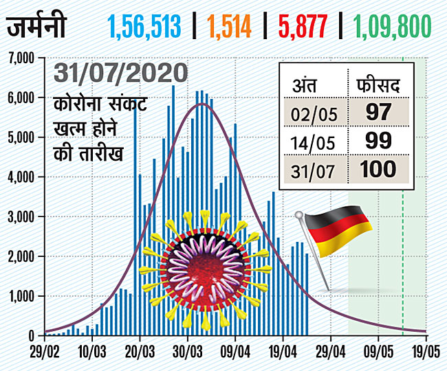 जर्मनी में भी फरवरी माह में ही कोरोना का कहर दिखना शुरू हुआ था। यहां अब तक एक लाख 56 हजार 513 कोरोना संक्रमण मरीज मिल चुके हैं, 5 हजार 877 लोगों की मौत हो चुकी है। एक लाख 9 हजार 800 लोग इस संक्रमण से ठीक भी हो चुके हैं। यहां 2 मई तक 97 फीसद, 14 मई तक 99 फीसद और 31 जुलाई तक 100 फीसद कोरोना संक्रमण से मुक्ति की उम्मीद है।
