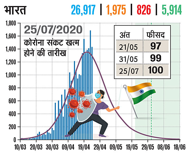 यदि भारत की बात करें तो 10 मार्च से कोरोना का प्रकोप दिखना शुरू हुआ। अब तक 26 हजार 917 लोग इससे संक्रमित हो चुके हैं, यहां 5 हजार 914 लोगों की जान जा चुकी है। यहां पर इससे छूटकारे के लिए 21 मई तक 97 फीसद, 31 मई तक 99 फीसद और 25 जुलाई तक 100 फीसद छूटकारा मिल जाने की उम्मीद है।