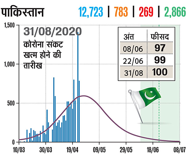 अब पाकिस्तान की बात करते हैं। पाकिस्तान में 10 मार्च से कोरोना संक्रमण देखने को मिला। यहां अब तक 12 हजार 723 मामले सामने आ चुके हैं। 269 लोगों की मौत हो चुकी है। मात्र 2866 लोग ठीक हो पाए हैं। पाकिस्तान में 8 जून तक 97 फीसद, 22 जून कर 99 फीसद और 31 जुलाई तक 100 फीसद छूटकारे की उम्मीद है।