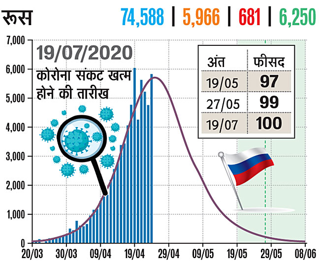रुस में भी 20 मार्च से कोरोना का प्रकोप दिखने लगा। यहां अब तक 74 हजार 588 मामले सामने आ चुके हैं। इसमें 681 लोगों की मौत हुई है और 6250 लोग ठीक होकर अपने घर को वापस गए हैं। रूस में 19 मई तक 97 फीसद, 27 मई तक 99 फीसद और 19 जुलाई को 100 फीसद कोरोना संकट खत्म होने की उम्मीद जताई जा रही है।