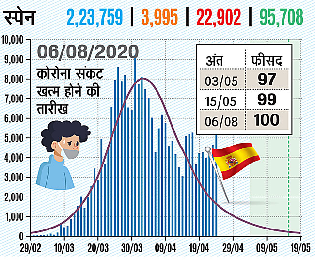 स्पेन को भी अगस्त माह में ही इस संक्रमण से छूटकारा मिलता दिख रहा है। फिलहाल यहां 2 लाख 23 हजार 759 लोग संक्रमित हो चुके हैं। 22 हजार 902 लोगों की मौत हो चुकी है। 95 हजार 708 लोग स्वस्थ भी हुए हैं। यहां 3 मई तक 97 फीसद, 15 मई तक 99 फीसद और 6 अगस्त तक 100 फीसद राहत मिल जाने की उम्मीद है।