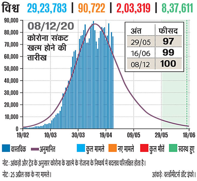 नोट- आंकड़ों और ट्रेंड के अनुसार कोरोना के खात्मे के रोजाना निष्कर्ष में बदलाव परिलक्षित होता है। आंकड़े वल्डॉमीटर्स डॉट इंफो। ये आंकड़े 25 अप्रैल तक के हैं।